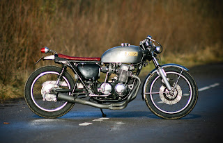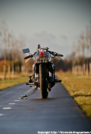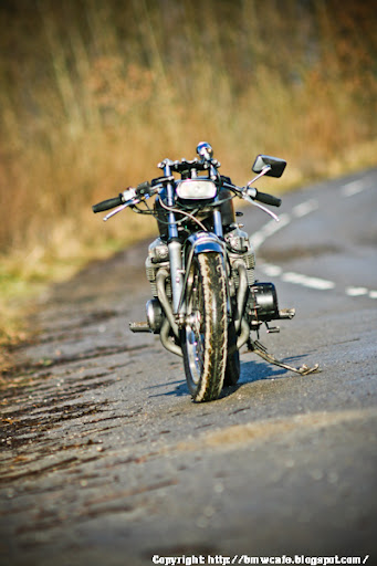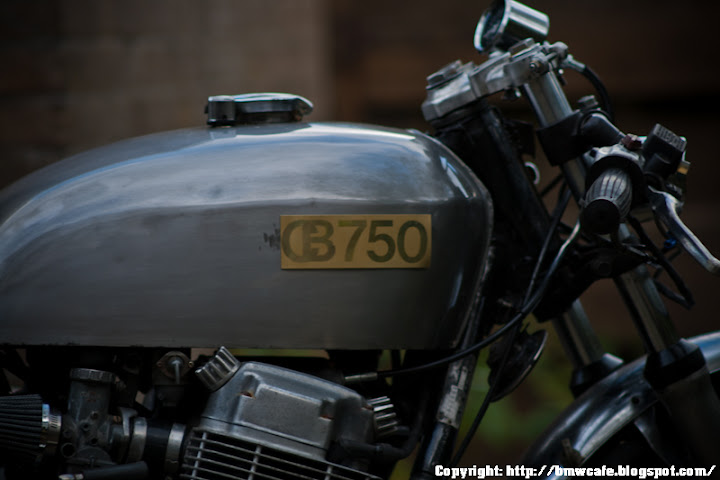 BMW cafè una nuova creazione: una honda cb 750 k2 del 1972 trovata in condizioni pessime e riportata a nuova vita con pochi soldi, con alcuni particolari "adattati" come il faro che nella sua precedente vita era un faro antinebbia di una macchina!